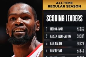 火箭球星杜蘭特三分命中后拿到個人生涯第32000分,依然排名歷史得分榜第6分,距身前的喬丹還差292分。