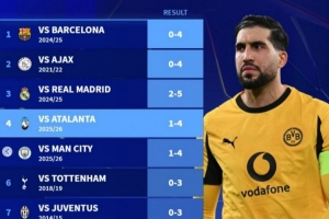 體育資訊2月27日訊 在歐冠淘汰賽附加賽次回合,多特1-4不敵亞特蘭大,總比分3-4被淘汰。德轉也盤點了多特在歐冠最大比分失利榜單,具體如下: