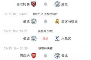 體育資訊02月27日訊 曼城3月8日開始死亡賽程,15天內(nèi)連戰(zhàn)紐卡(足總杯)、皇馬(歐冠兩回合)以及阿森納(聯(lián)賽杯決賽)!