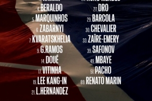 前鋒:7-克瓦拉茨赫利亞、9-貢薩洛·拉莫斯、14-杜埃、29-巴爾科拉、49-姆巴耶
