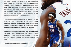 “親愛的費城,經歷了如此密集的一年后,要說再見真的很難。能夠代表這座城市,為你們而戰度過這個賽季,是無上的榮耀。你們張開雙臂歡迎我,在順境與逆境中都支持我,我永遠不會忘記每個比賽之夜,我們主場那難以言喻的能量。
