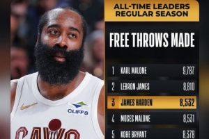 本場比賽過后,哈登生涯總罰球命中數(shù)來到8535個(gè),超越摩西·馬龍(8531個(gè))升至歷史第3,排在第2的是詹姆斯(8810個(gè))。