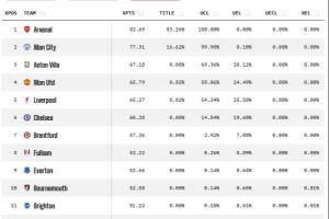 體育資訊03月02日訊 英超第28輪結(jié)束,OPTA更新了英超奪冠概率,其中阿森納83.26%領(lǐng)跑,曼城16.62%,維拉0.08%,曼聯(lián)和利物浦0.02%,切爾西0%。