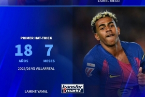 體育資訊3月3日訊 德國轉會市場盤點了部分球星首次戴帽的年齡,姆巴佩17歲,亞馬爾18歲,梅西19歲。