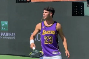 這是繼此前備戰澳大利亞網球公開賽時身穿詹姆斯球衣訓練后,阿爾卡拉斯再次穿上詹姆斯球衣進行賽前訓練。