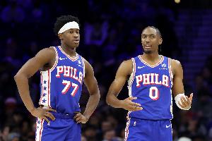 上半場最后一攻,埃奇庫姆反擊追身三分出手,被身后追防的卡特·布萊恩特撞到失去平衡摔倒,背部著地受傷離場,76人官方隨后宣布埃奇庫姆背傷不會回歸。