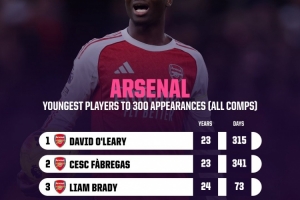 以下為阿森納隊史達成300場里程碑最年輕球員top5: