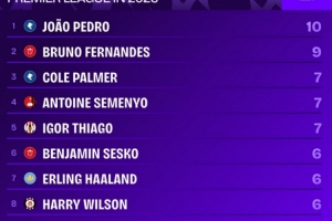 體育資訊3月5日訊 Squawka統(tǒng)計了2026年球員在英超的參與進球數量,并列出榜單,若昂·佩德羅參與10球居首,B費參與9球次席。