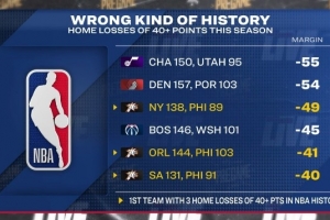 轉播方賽前曬出一組數據,本賽季共有6次主隊輸球至少凈負40分的情況: