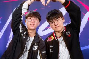 體育資訊7月10日訊?2025MSI勝者組GEN vs T1賽前,LOL官方發(fā)布兩隊下路Ruler和Gumayusi比心合照。