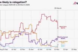 體育資訊3月5日訊 本賽季英超保級爭奪戰日趨激烈,數據網站OPTA分析了目前15-18名球隊在本賽季降級概率走勢情況。