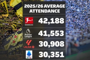 本賽季歐洲聯賽場均上座人數排名: