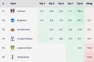 Football Meets Data給出了最新的各隊降級概率,熱刺降級概率已經升至16%。若下一輪熱刺不敵利物浦,那么降級概率將至少來到19%。