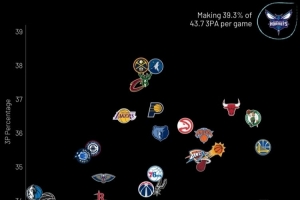 橫軸-三分總出手?jǐn)?shù);縱軸-三分命中率;黃蜂場(chǎng)均出手43.7次&命中率為39.3%