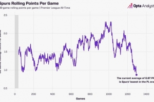 熱刺在過去的38場英超比賽中僅積33分。場均0.87分的得分率是該俱樂部整個聯賽歷史上在連續38場比賽跨度內的最低紀錄(按勝場積3分計算),追平了其在1912年和1915年創下的戰績。