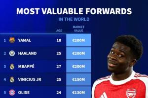 體育資訊03月08日訊 明天,德轉(zhuǎn)將會(huì)更新英超球員身價(jià),德轉(zhuǎn)今天列出了現(xiàn)在的前鋒位置球員身價(jià)榜,亞馬爾、哈蘭德、姆巴佩2億歐居首。