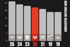 體育資訊7月10日訊??GEN擊敗T1晉級MSI決賽,與此同時GEN戰隊的連勝場次來到了22場。目前GEN位列歷史第四,距離追平T1保持的連勝紀錄僅差4場勝利。