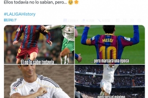 西甲官方曬出梅西的對比照,同時配文:“他還不知道,但他會成為巴薩標志性人物”,而對于C羅的對比照,西甲官方配文:“他還不知道,但他會成為皇馬歷史最佳射手”。