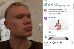 在社交媒體上,哈蘭德延續了自己一貫不茍言笑的風格,他曬出了自拍照并寫道:胡須一點點長出來了。