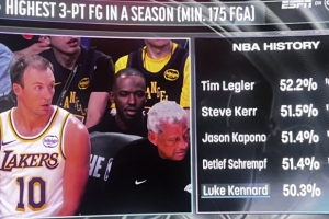 湖人VS尼克斯,轉(zhuǎn)播方曬肯納德數(shù)據(jù),本賽季肯納德三分命中率已經(jīng)來到50.3%,能排進NBA單賽季歷史前五(至少出手175次及以上):
