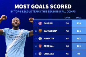 體育資訊3月9日訊 德國轉會市場統計了五大聯賽球隊本賽季各賽事的進球數量,并列出榜單,拜仁128球居首,巴薩111球次席。