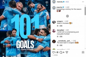 體育資訊3月10日訊 本賽季到目前為止,曼城各項(xiàng)賽事總計(jì)踢了45場比賽,已經(jīng)打進(jìn)101粒進(jìn)球,俱樂部官方也曬出海報(bào),慶祝本賽季進(jìn)球破百。