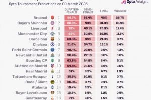 體育資訊3月10日訊 歐冠1/8決賽即將開戰(zhàn),Opta超級(jí)計(jì)算機(jī)預(yù)測(cè)了各隊(duì)晉級(jí)8強(qiáng)的概率,并列出榜單。