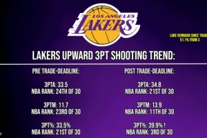 交易得到肯納德后:場均出手34.8次(聯(lián)盟第21),命中13.9記(第11),三分命中率39.9%(第3)