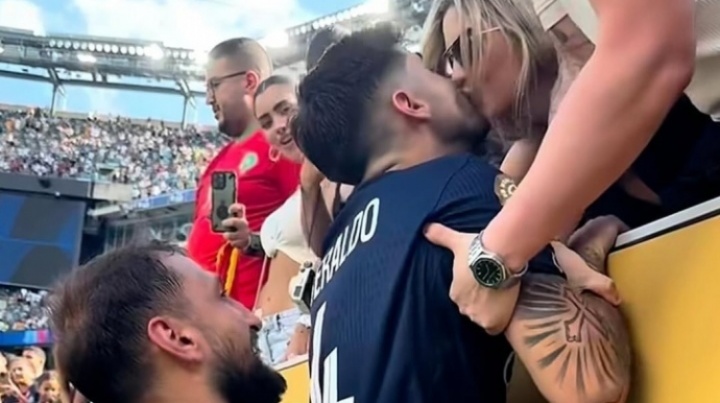比賽結束后 ,多納魯馬貼心的把貝拉爾多“舉上看臺”,讓他可以親吻女友???? ???