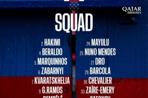 前鋒:7-克瓦拉茨赫利亞、9-貢薩洛·拉莫斯、10-登貝萊、14-杜埃、29-巴爾科拉、49-姆巴耶