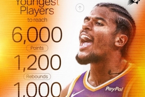 體育資訊7月11日訊 太陽官方曬出一張關于“拿到6000分+1200籃板+1000助攻最年輕的8位球員”數據圖,并配文寫到:“躋身頂級行列?!?/p>