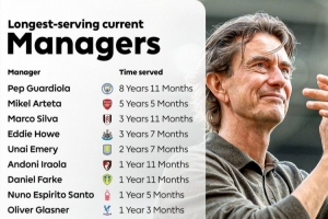 據英超官方統計,瓜迪奧拉是當前執教時間最長的主帥,阿爾特塔次席,馬爾科-席爾瓦第三。