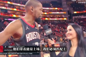 體育資訊3月14日訊 NBA常規賽,火箭107-105擊敗鵜鶘。賽后杜蘭特接受記者瓦妮莎的場邊采訪。