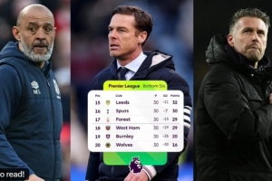本輪英超在積分榜后6位的球隊中,有5隊都拿到1分(狼隊還未賽),其中利茲聯0-0戰(zhàn)平水晶宮,諾丁漢森林0-0戰(zhàn)平富勒姆,西漢姆1-1戰(zhàn)平曼城,伯恩利0-0戰(zhàn)平伯恩茅斯。
