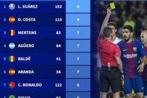 1、蘇亞雷斯,總黃牌數(shù)152,假摔黃牌數(shù)9