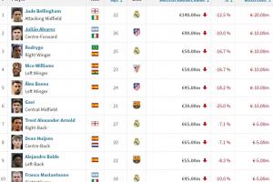 體育資訊03月16日訊 德轉今日更新西甲身價,貝林、羅德里戈等多名皇馬球員身價下跌。