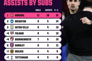 體育資訊3月17日訊 Opta統計了2025/26賽季英超聯賽中,各隊替補球員貢獻的進球和助攻數據,阿森納位列第一。