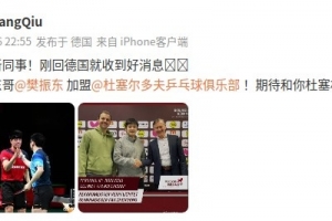 效力杜塞爾多夫的華裔選手邱黨更新社媒,對樊振東即將加盟表示歡迎。邱黨在社媒寫道:
