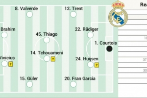 附阿斯預(yù)測皇馬首發(fā):1-庫爾圖瓦;20-弗蘭·加西亞、24-赫伊森、22-呂迪格、12-阿諾德;15-居萊爾、14-瓊阿梅尼、45-蒂亞戈·皮塔奇、8-巴爾韋德;7-維尼修斯、21-卜拉欣·迪亞斯