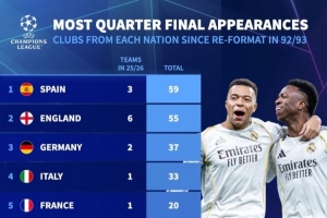 體育資訊3月17日訊 德國轉(zhuǎn)會市場統(tǒng)計了1992-1993賽季歐冠改制以來各國球隊晉級8強(qiáng)的次數(shù),并列出榜單,西班牙59次最多,英格蘭55次第二。