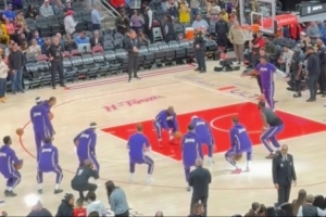 賽前,籃球評論員王猛曬出現場視頻,并寫道:“湖人賽前儀式結束,一個都沒進,但還挺逗。”
