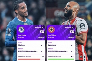 體育資訊3月19日訊 Squawka對比了切爾西前鋒若昂·佩德羅和布倫特福德前鋒伊戈爾·蒂亞戈本賽季的英超場均數據。