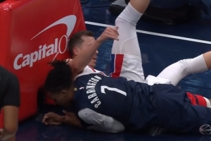 GIF-卡林頓空接暴扣,下來后順帶帶倒鄧羅,裁判吹鄧羅防守犯規后還追加杜倫T;活塞挑戰后,又追加卡林頓T