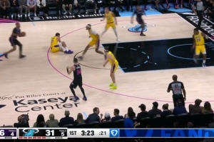 GIF-鏡頭過來東契奇倒在地上,鮑威爾上籃命中,湖人暫停,東契奇一瘸一拐的