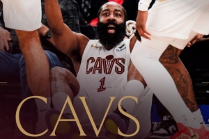 賽后球隊發(fā)布哈登海報慶祝勝利,畫面為哈登坐在地上被隊友拉起瞬間。