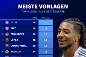 體育資訊3月21日訊 德國轉會市場統(tǒng)計了五大聯賽球員本賽季各賽事的助攻次數,并列出榜單,奧利塞27助斷層居首。