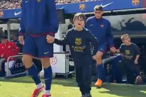 體育資訊3月22日訊 西甲第29輪比賽,巴薩在諾坎普迎戰巴列卡諾。本場比賽之前,巴薩球員手牽唐氏綜合癥球童走進球場,表達了對他們的關愛。