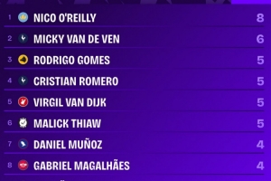 本賽季英超后衛球員進球榜:奧賴利8球居首,范德芬6球次席