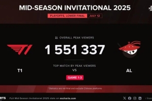 體育資訊7月12日訊 2025MSI敗者組決賽T1對(duì)陣AL第四局比賽正在進(jìn)行中。外媒數(shù)據(jù)統(tǒng)計(jì)媒體發(fā)布數(shù)據(jù),目前本場(chǎng)觀眾峰值達(dá)到了1551337。