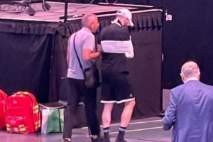 賽后鏡頭拍到阿拉基肩膀做了固定,他走起路來很不自然。